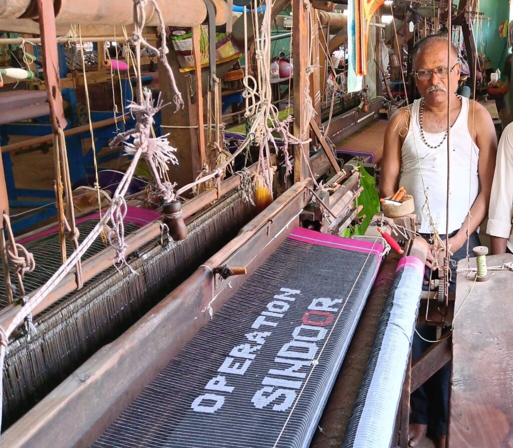 ಇನ್ನೊಂದು ಬದಿಯ ಸೆರಗಿನಲ್ಲಿ ಇತ್ತೀಚೆಗೆ ಭಾರತ ದೇಶವು ನಡೆಸಿದ “ಆಪರೇಷನ್ ಸಿಂಧೂರ್” ಕಾರ್ಯಚರಣೆಯ ಹೆಮ್ಮೆಯ ಪ್ರತೀಕವಾಗಿ ಅಕ್ಷರಗಳನ್ನು ಬುಟ್ಟಾ ತಿರುಕಿ ಮಾಡಕೊಂಡು, ಹಾಗೂ ನೀಲಿ ಮತ್ತು ತ್ರಿವರ್ಣಗಳ ಯುದ್ಧ ವಿಮಾನಗಳನ್ನು ಕೊಂಡಿ ತಂತ್ರಜ್ಞಾನ ಉಪಯೋಗಿಸಿ ನೇಯಲಾಗಿದೆ. ಮುಂದುವರೆದು ವಡ್ಡಲದಲ್ಲಿ ಕೊಂಡಿ ತಂತ್ರಜ್ಞಾನ ಉಪಯೋಗಿಸಿಕೊಂಡು ಕಡಲ ಅಲೆಗಳ ಮಾದರಿ ವಿನ್ಯಾಸಗಳನ್ನು ನೇಯಲಾಗಿದೆ.