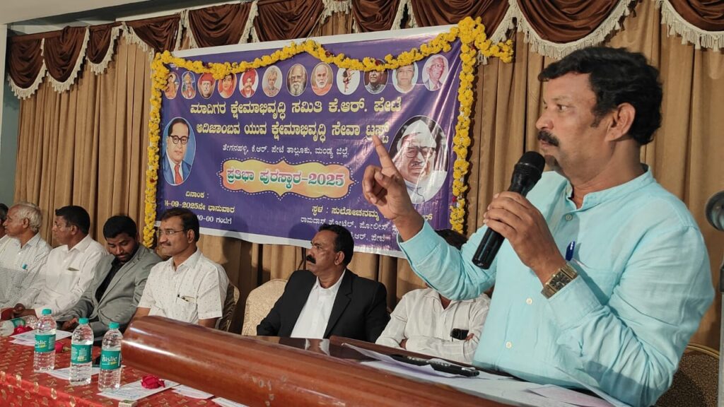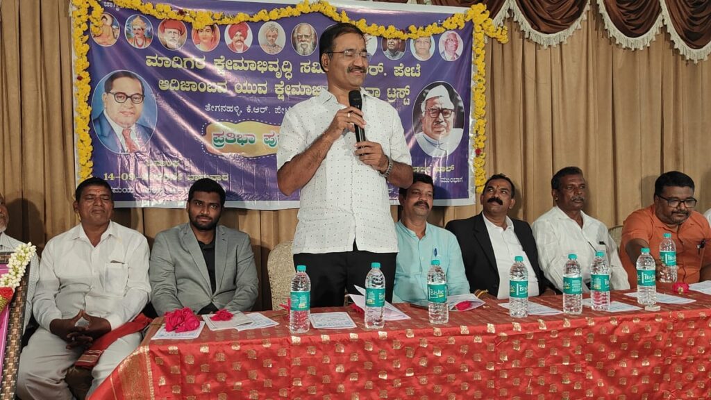 ಆದಿಜಾಂಬವ ಮಾದಿಗ ಸಮಾಜದ ಬಂಧುಗಳು ತಮ್ಮ ಮಕ್ಕಳನ್ನು ಕಡ್ಡಾಯವಾಗಿ ಶಾಲೆಗೆ ಕಳಿಸಿ ವಿದ್ಯಾವಂತರನ್ನಾಗಿ ಮಾಡಿಸುವ ಮೂಲಕ ಸಮಾಜದ ಮುಖ್ಯ ವಾಹಿನಿಗೆ ಬಂದು ಸಾಧನೆ ಮಾಡಿ ಮುನ್ನಡೆಯುವಂತೆ ಬೆನ್ನು ತಟ್ಟಿ ಪ್ರೋತ್ಸಾಹಿಸಬೇಕು ಎಂದು ನಾಡಿನ ಖ್ಯಾತ ವಿಚಾರವಾದಿಗಳು ಹಾಗೂ ಚಿಂತಕರಾದ ಅರಕಲವಾಡಿ ನಾಗೇಂದ್ರ ಹೇಳಿದರು.ಅವರು ಕೃಷ್ಣರಾಜಪೇಟೆ ಪಟ್ಟಣದ ರಾಮದಾಸ್ ಹೋಟೇಲ್ ನ ಸಭಾಂಗಣದಲ್ಲಿ ಕೆ.ಆರ್.ಪೇಟೆ ತಾಲೂಕಿನ ಮಾದಿಗರ ಕ್ಷೇಮಾಭಿವೃದ್ಧಿ ಸಮಿತಿ ಹಾಗೂ ತೇಗನಹಳ್ಳಿಯ ಆದಿ ಜಾಂಬವ ಯುವ ಕ್ಷೇಮಾಭಿವೃದ್ಧಿ ಸೇವಾ ಟ್ರಸ್ಟ್ ಸಂಯುಕ್ತ ಆಶ್ರಯದಲ್ಲಿ ಆಯೋಜಿಸಿದ್ದ ಪ್ರತಿಭಾ ಪುರಸ್ಕಾರ ಹಾಗೂ ಮೀಸಲಾತಿಯಲ್ಲಿ ಒಳ ಮೀಸಲಾತಿ ಮಹತ್ವ ಮತ್ತು ಶಿಕ್ಷಣದ ಮೂಲಕ ನಿರುದ್ಯೋಗ ಹೋಗಲಾಡಿಸುವುದು ಹೇಗೆ ಎಂಬ ವಿಚಾರ ಸಂಕಿರಣದಲ್ಲಿ ಭಾಗವಹಿಸಿ ಮಾತನಾಡಿದರು